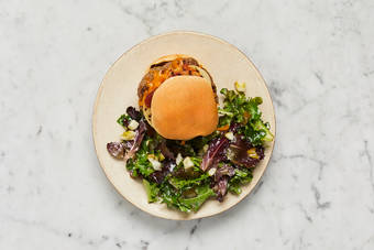 Quoi de mieux qu’un burger parfaitement cuit, garni d’oignons grillés, de cheddar et de cornichons? Accompagnez le tout d’une salade de chou acidulée aux cornichons. Voilà un repas d’été idéal à déguster sur une terrasse! Ingrédients : Bœuf haché • Pain artisan (farine de blé enrichie, eau, huile de canola, levure, sucre, sucre inverti, sel, vinaigre, fibres d'agrumes, mono- et diglycérides d'acides gras, farine de soya, carbonate de calcium, stéaroyl-2-lactylate de sodium, phosphate monocalcique, amylase, xylanase, acide ascorbique, adoucissant pour pâte, sorbate de potassium, propionate de calcium, sulfate de calcium, levain de blé dur séché (produits de blé dur moulus, culture bactérienne), gomme xanthane, gomme guar) (lait, soya, blé) • Oignon jaune • Mélange printanier (laitue multi-feuilles lolla rosa, laitue feuille de chêne rouge, laitue multi-feuilles rouge, laitue de chêne verte, laitue bally hoo tango) • Cornichons à l’aneth (concombres, eau, vinaigre, sel, chlorure de calcium, benzoate de sodium, épices, arômes naturels, polysorbate 80, curcuma) • Vinaigrette ranch (huile de canola et/ou de soya, babeurre (lait partiellement écrémé, sel, culture bactérienne), vinaigre blanc, eau, sucre, sel, jaune d'oeuf congelé, épices, polysorbate 60, gomme xanthane, arôme naturel, glutamate monosodique, acide lactique , benzoate de sodium, lactate de calcium, EDTA de calcium disodique ) (œuf, lait) • Ketchup (pâte de tomates, eau, sucres (sucre, glucose-fructose), vinaigre, sel, assaisonnement, oignon en poudre, épices, acide citrique, sorbate de potassium, benzoate de sodium) • Cheddar (lait pasteurisé, substances laitières modifiées, crème, culture bactérienne, sel, rocou, bêta-carotène, chlorure de calcium, enzyme microbienne, cellulose, natamycine) (lait) • Sel d'ail (sel, poudre d'ail, dioxyde de silicium)