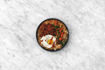 riz de chou-fleur, œuf sur le plat et graines de sésame noir