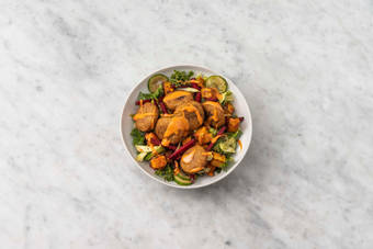 med sötpotatissallad och srirachamajo