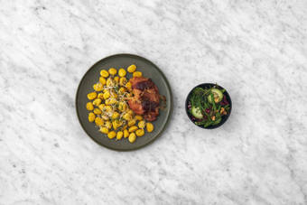met zoete-aardappelpuree, rucola en veldsla