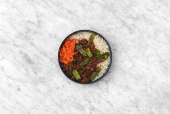 geïnspireerd op Koreaanse BBQ, met rijst en zoetzure wortel
